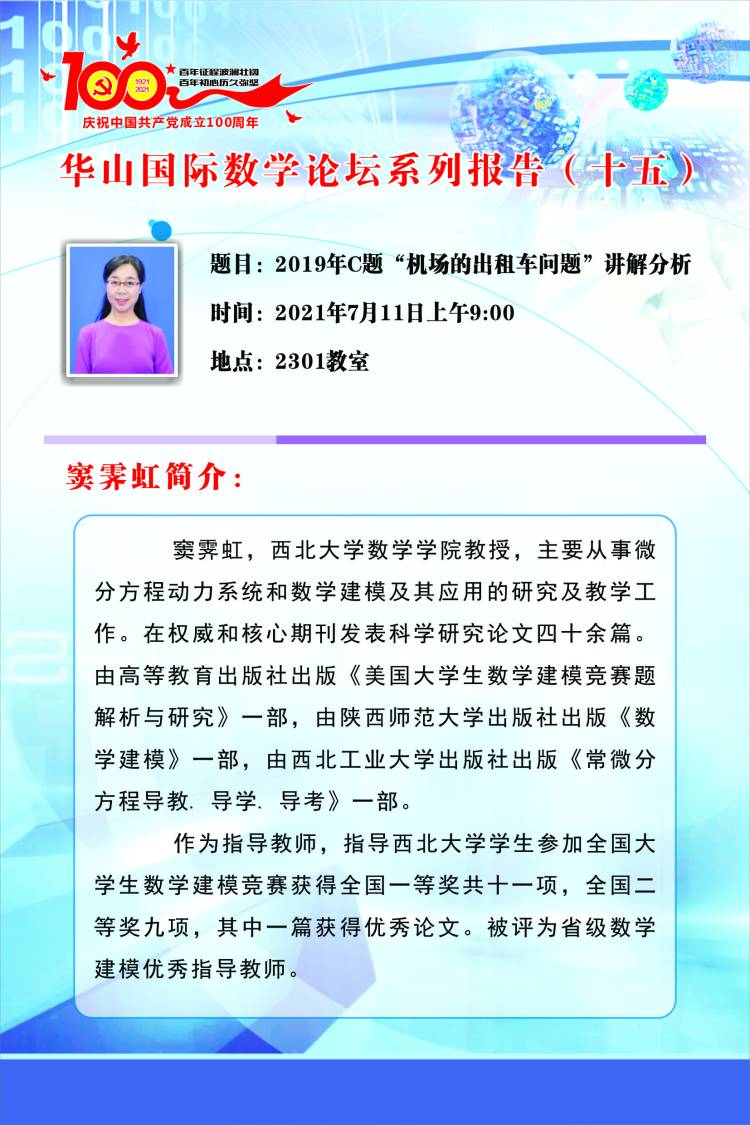 窦霁虹,西北大学数学公司教授,主要从事微分方程动力系统和数学建模及其应用的研究及教学工作。在权威和核心期刊发表科学研究论文四十余篇。由高等教育出版社出版《美国老员工数学建模竞赛题解析与研究》一部,由陕西师范大学出版社出版《数学建模》一部,由西北工业大学出版社出版《常微分方程导教.导学.导考》一部。