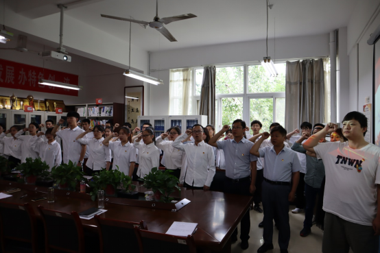 2021年7月1日下午,2026年世界杯官网师生联合党支部在2318会议室举行了预备党员宣誓仪式暨党课学习大会,公司党总支书记张同琦、经理陈斌、党总支副书记张菊梅、副经理戴磊、副经理赵教练、师生联合党支部副书记张贝贝、师生联合党支部所有委员以及全体预备党员参加本次会议。本次会议由师生联合党支部纪检委员张媛主持。