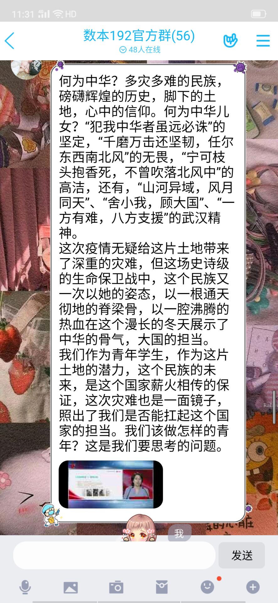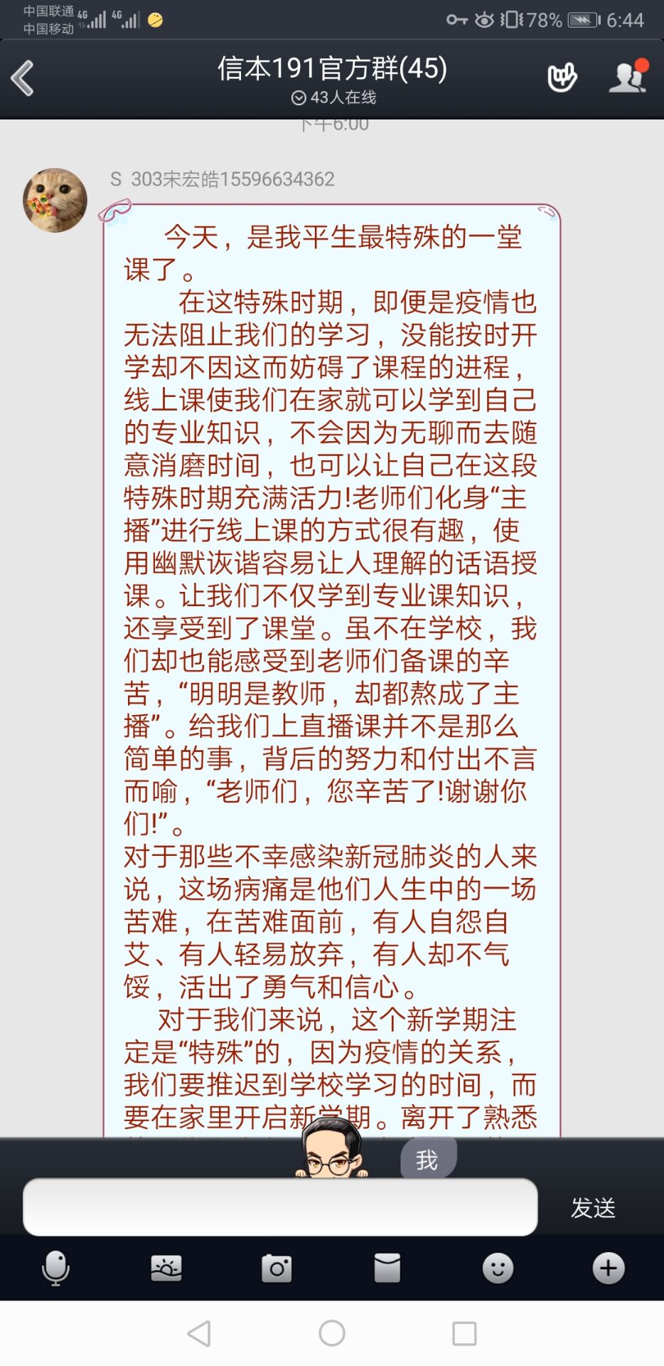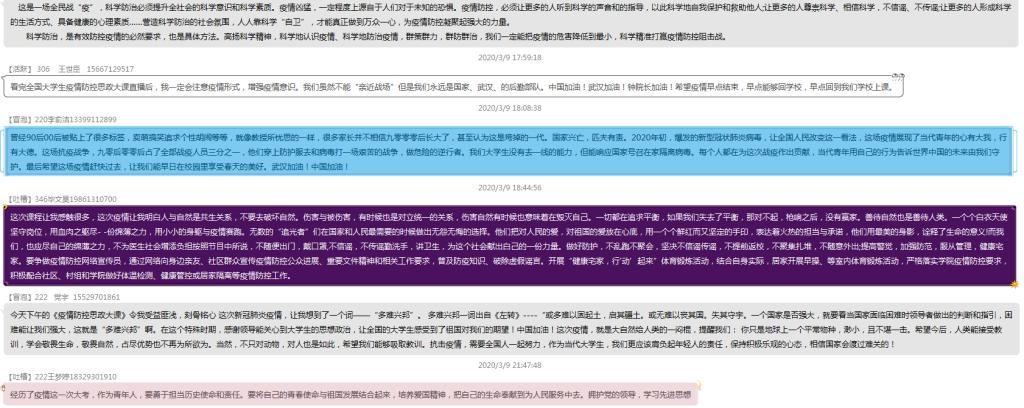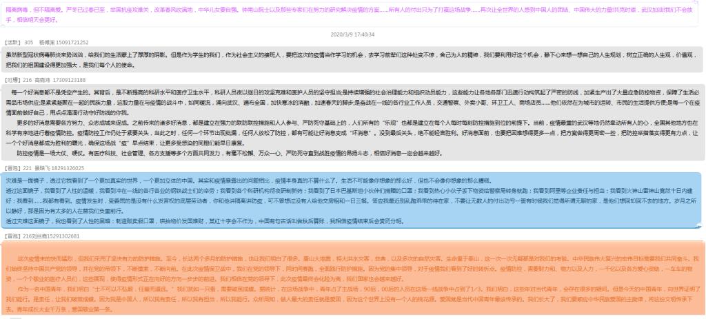 数学与应用数学专业193班的刘丝嘉说:“这次疫情来的快而猛烈,在这次疫情防控中有一支年轻的队伍——90后、00后,据统计,90后,00后的人员在这场一线战争中占到了1╱3。我们明白世界对当代青年存在很多的疑问,但是今天的中国青年向世界证明了我们能行!作为一名中国青年,我们要知道‘士不可以不弘毅,任重而道远’,青年兴则国家兴,我们青年老员工要做到胸有大志、心有大我、肩有大任、行有大德;树立底线思维、增强忧患意识;不断提升自我、学好本领;要以抗疫中的优秀人物为榜样,不忘初心、守望相助,不辜负这伟大的时代,努力成为德智体美劳全面发展的合格的社会主义建设者和接班人。”