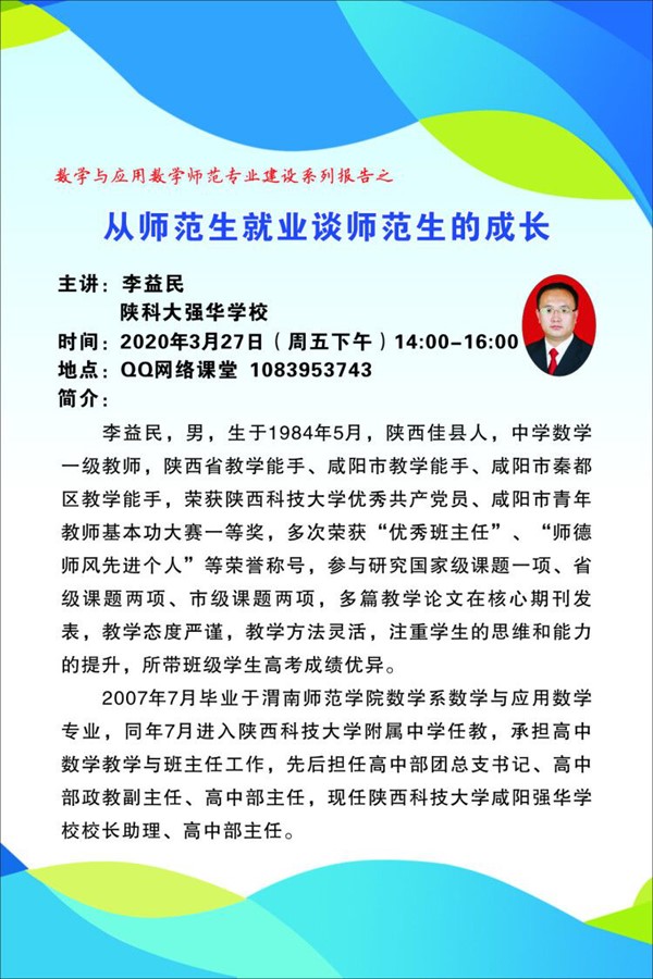 以往师范生技能培训都是校内教师指导,但四年级员工到地方中学教育实习时总感觉力不从心,究其原因,还是员工对当下中学的教学环境和教学内容不了解不熟悉。为此,经过前期筹划和多次协调,3月27日下午2点,公司邀请数学与应用数学专业2007级优秀员工李益民(陕西科技大学附属强华公司董事长助理,高中部主任),通过QQ+屏幕分享方式,同步在线为参加此次技能训练的140名师范生做了一场专业而精彩的报告——《从师范生就业谈师范生的成长》。李益民的报告以师范生就业倒推师范生在校期间应该如何加强专业学习和技能训练,深入浅出,分享了他个人在师范学习、中学数学教学、班级管理、教师招聘等环节中的宝贵经验,并向学弟学妹们提出了要求和希望。本次活动突破了时空限制,让公司140名师范生和数十名教师受益匪浅,了解当下中学数学教学的很多实际情况。李益民在2003年进入公司数学与应用数学专业学习伊始就很认真,不管个人学习,班级管理,还是当时任数学系员工会主席等都表现出了较强的组织协调能力,是我们现在班干部的榜样。员工们也都纷纷表示要扎实学习,努力训练,向优秀的学长学习。教师们也表示这是一次很成功的报告,更坚定了教书育人的信心。