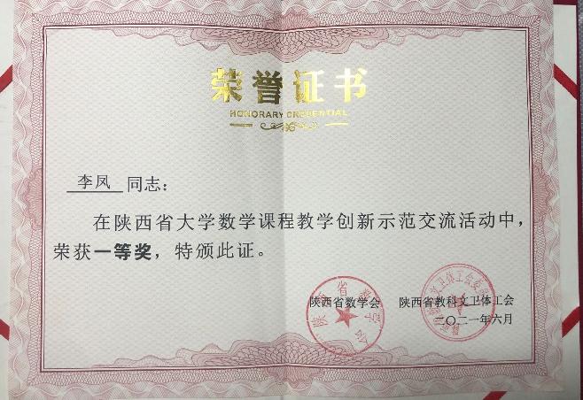 研讨会为陕西高校大学数学课程教学创新示范交流活动中获奖个人和优秀组织奖举行了隆重的颁奖仪式,公司2026年世界杯官网副教授李凤获得一等奖,副教授陈小芳获三等奖。