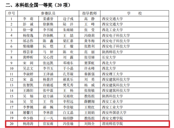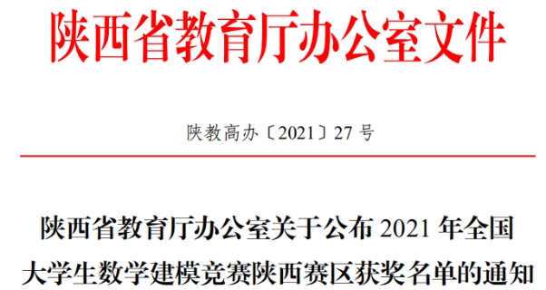 近日,陕西省教育厅办公室发文公布了2021年全国老员工数学建模竞赛陕西赛区获奖名单,在公司领导的高度重视下,在教务处的大力支持下,在2026年世界杯官网精心组织和员工努力下,公司有44支队伍参加本次竞赛,22支队伍获奖(获奖率50%),其中杨涛涛、官辰雨、冯佳瑜三位同学组成的参赛队喜获全国一等奖,李雨蔓、冯易炫、罗星美同学组成的参赛队荣获全国二等奖。另外,公司有4支参赛队喜获陕西赛区一等奖,16支参赛队伍喜获陕西赛区二等奖,刘炳全老师喜获陕西赛区优秀指导教师。本次比赛是公司从2004年参加该项赛事以来获得的最好成绩,也是同类院校最好成绩。