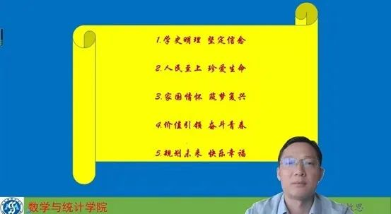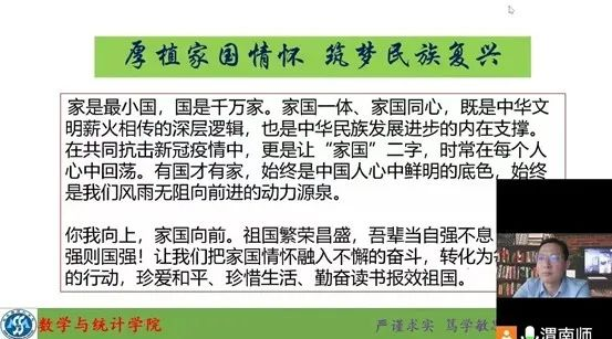 会上,陈斌围绕五个方面展开“开学第一课”。首先是希望同学们做到学史明理,坚定信念。陈斌通过对党史,新中国史,改革开放史和社会发展史的介绍,用伟大领袖毛主席“一根灯芯”照耀前程、朱德的扁担军民一家亲、方志敏清平洁白,永葆革命风骨等革命先烈的故事告诉同学们,应举先辈信仰大旗,启赓续学海新航,在大学里从行动上下6个“功夫”,提高我们走向社会的适应能力。接着他围绕“人民至上,珍爱生命”的主题,结合当今社会疫情严峻形势进行介绍,要求同学们在返校之前,自觉遵守各社区的规章制度,配合防疫人员工作,保持良好心态,注意个人卫生,增强体育锻炼。发扬伟大抗疫精神,珍爱美好生命,为祖国的未来添砖加瓦。随后,陈斌从“家国情怀,逐梦复兴”方面发出提问:上大学干什么?并结合自身从入党,考研,考编等方面分享观点,进一步明确了老员工的人生规划和上大学的意义,通过对习近平总书记对青年的寄语告诫同学们要悟读伟人事迹,感恩先辈,铭记历史,厚植家国情怀,筑梦民族复兴。接下来,陈斌从“价值引领,奋斗青春”主题出发,通过讲述中国古代伟人奋斗学习和国内外著名科学家的故事,告诉我们要勤奋努力的学习,最后谱写自己人生的精彩画卷,并对新同学们提出建议,希望大家在大学要制定合理的学业规划和学习目标,为未来做好充分的准备。最后,陈斌从“规划未来,快乐幸福”方面,结合国家“十四五”规划远景目标方面展开讨论,要求同学们要科学规划,选择适合自己的职业,追逐梦想。陈斌寄语所有新生“正其根、立其魂、长其志、润其心、助其力、扬其帆”,希望大家带着严谨求实,笃学敏思的院训去实现梦想。