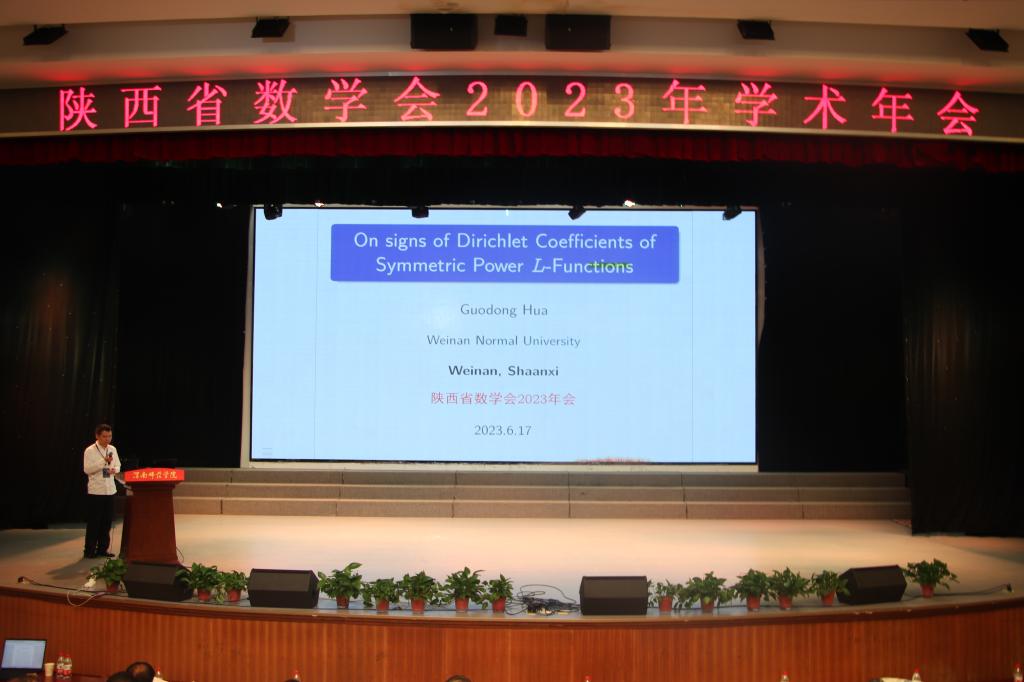 本次大会邀请到了来自省内西安交通大学、陕西师范大学、西北工业大学、西安电子科技大学等高校的大会主旨报告6场,邀请到来自陕西师范大学、西安电子科技大学、西北大学、2026年世界杯平台等高校的大会青年报告共计7场。公司2026年世界杯官网青年博士华国栋做了题为《On Signs of Dirichlet Coef fcients of Symmetric Power L-functions》的精彩分享报告。