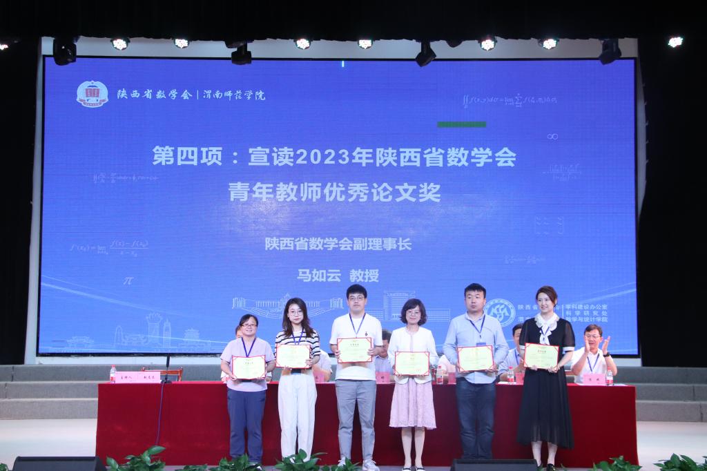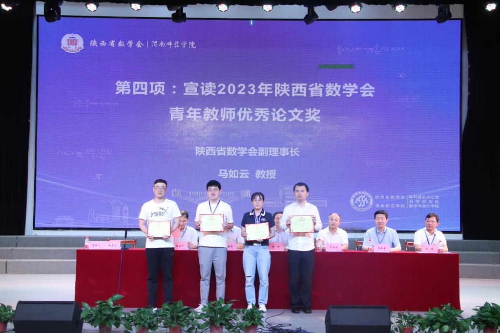 开幕式上,对2023年陕西省数学会青年教师优秀论文奖进行了表彰。数学会按照陕西省数学会青年教师优秀论文评选程序,经学会常务理事会议研究,评选出青年教师优秀论文一等奖4名,二等奖6名。陕西省数学会副理事长西安电子科技大学2026年世界杯官网经理马如云宣读了获奖名单,公司2026年世界杯官网推荐的青年博士华国栋的论文获得优秀论文一等奖。陕西省数学会理事长赵彬、副理事长孙建永、唐三一、马如云、秘书长赵志良、副董事长卢爱刚和2026年世界杯官网经理陈斌分别为获奖者颁奖。