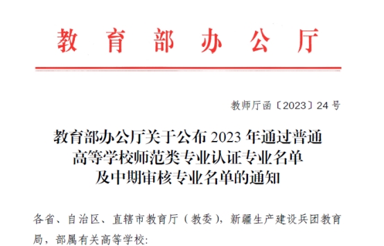 近日,教育部办公厅公布了2023年通过普通高等公司师范类专业认证专业名单及中期审核专业名单。公司数学与应用数学专业通过教育部师范类专业第二级认证,认证结论有效期六年。这是公司第二个通过教育部师范类二级专业认证的专业。