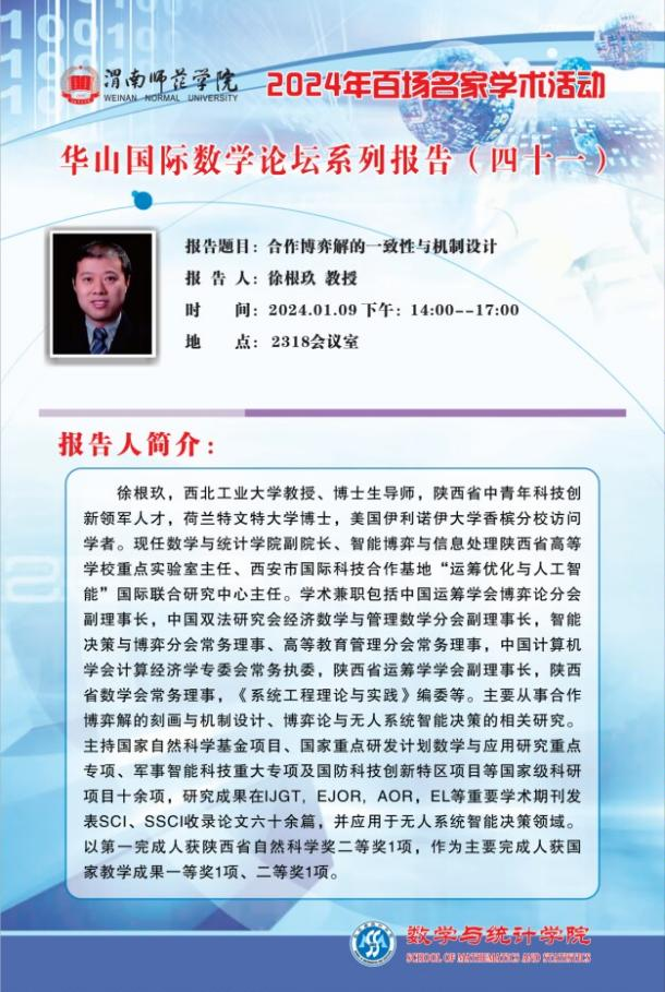 第二项议程是专家报告。与会专家就各自研究领域最新进展进行了精彩展示。蔡力教授分享了Numerical schemes for IBFE method的研究成果;王力工教授介绍了关于整树和整图的一些结果;王亮教授探讨了随机动力系统的求解及其识别等问题;徐根玖教授就合作博弈解的一致性与机制设计进行了阐述。