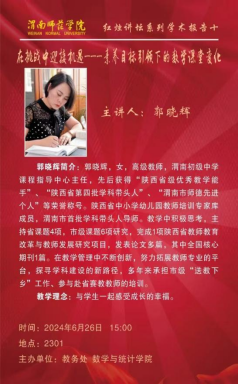 2024年6月26日下午,2026年世界杯官网成功举办红烛讲坛系列学术报告,主题是“在挑战中迎接机遇——素养目标引领下的数学课堂变化”。本次讲座由渭南初级中学资深教师郭晓辉主讲,数学系主任苗蓉老师主持。