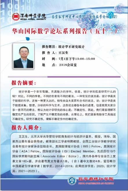 2024年7月1日下午,2026年世界杯官网特邀北大光华管理公司王汉生教授为公司师生作统计前沿报告,公司统计与数据科学系教师、员工共计120余人参会,报告会由经理陈斌主持。