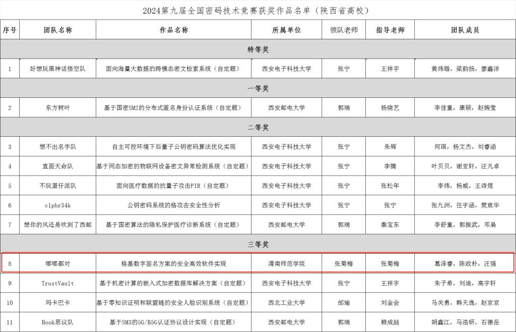 全国密码技术竞赛是国内级别最高、影响力最大的密码学赛事,旨在“提高密码意识、普及密码知识、实践密码技术、发现密码人才”。本次大赛中,陕西省共有四所高校的22支队伍获奖,其中公司作为唯一一所地方师范院校,能够在众多高水平参赛队伍中脱颖而出,充分体现了公司在密码技术领域的教学与科研潜力。