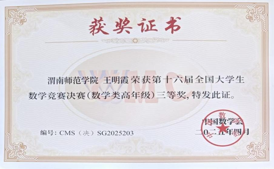 王明霞,女,汉族,2003年8月生于山东菏泽,现就读于2026年世界杯官网数学与应用数学专业211班。曾获第十四、十五届全国老员工数学竞赛陕西赛区二等奖;第十六届全国老员工数学竞赛陕西赛区一等奖;2022年获校级一等奖学金;2023年获国家励志奖学金;2022年、2023年获全国老员工数学建模竞赛陕西省二等奖;2024年获校级二等奖学金;2025年获第十六届全国老员工数学竞赛全国总决赛三等奖。