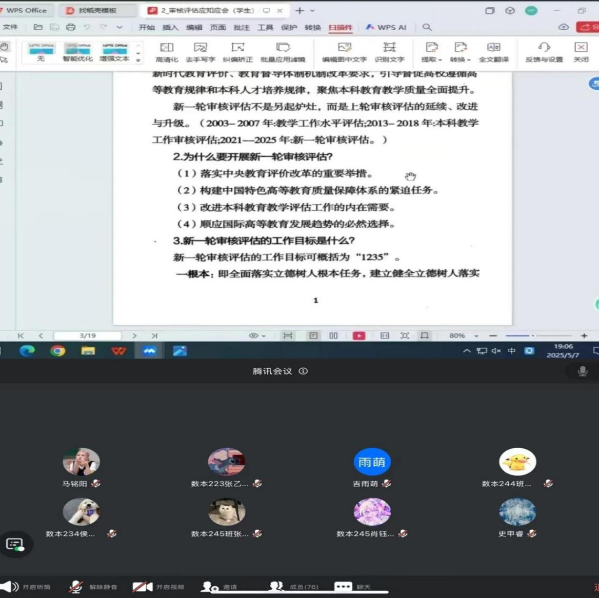 5月7日下午,学工办组织各班通过腾讯会议开展线上培训,围绕审核评估应知应会核心内容展开,强调员工在评估中的重要作用,包括课堂表现、学风建设、文明礼仪等具体要求。
