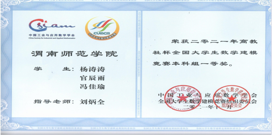 2021年公司在全国老员工数学建模竞赛中获得全国一等奖